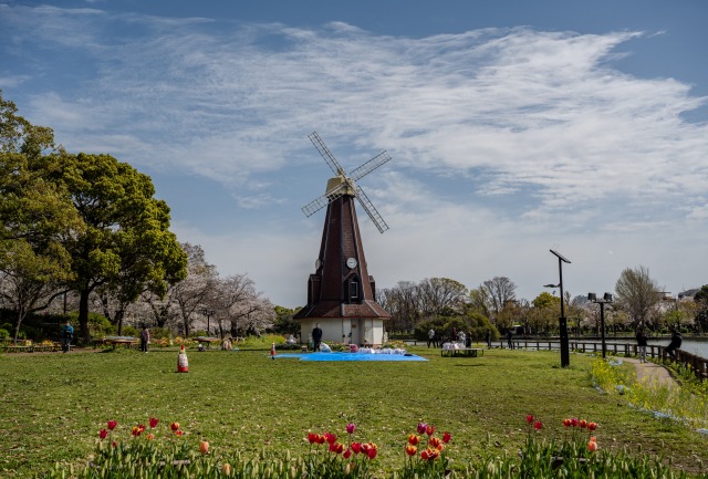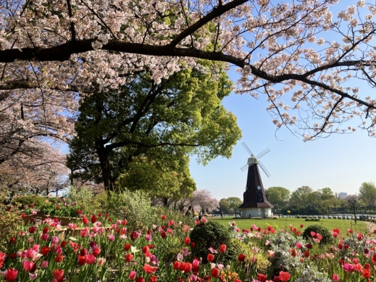 Ukima Park not only features cherry blossoms but also bursts into color with other spring flowers sometimes. You can aim for photos rich in "spring colors" combining tulips, windmills, and cherry blossoms.