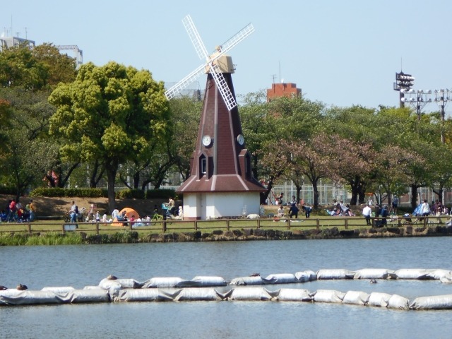 ・A rare scene in Tokyo where pond, cherry blossom row, and windmill coexist simultaneously