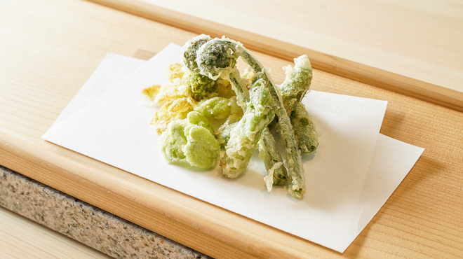 "Naniwa Tempura Ishin" offers an elevated tempura experience, frying seasonal vegetables and seafood crisply using delicate cottonseed oil. Enjoy unique flavor pairings curated by a sommelier, including fine wines and champagne that bring out new dimensions in each bite.