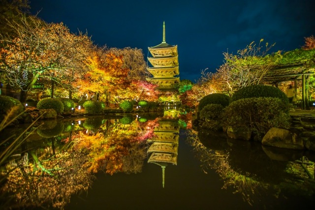 Features: Famous for its five-story pagoda, To-ji is popular for its nighttime light-up combined with autumn leaves. The illuminated autumn foliage alongside the reflection of the pagoda silhouette in the pond offers a beautiful photographic spot.