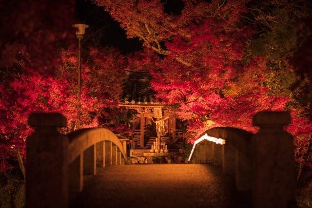 Features: Eikan-do, famous nationwide as a spot for autumn leaves, holds a nighttime light-up during peak foliage. Around 3,000 maple trees colored red and orange glow under the light. The combination with ponds and stone pavements creates a fantastic world.