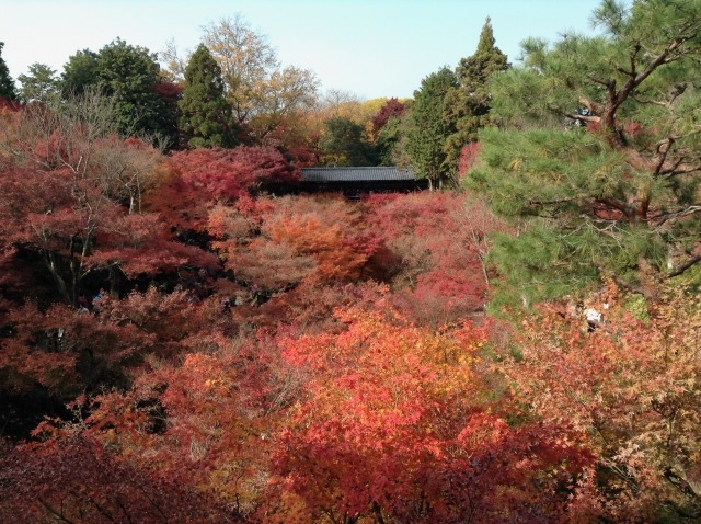 Tofukuji Temple boasts several iconic spots for autumn leaf viewing, but none more famous than the view from Tsuten Bridge. Spanning across the Sengyokukan valley, the bridge offers an unforgettable panorama of fiery red maples on both sides, captivating all who stand there.