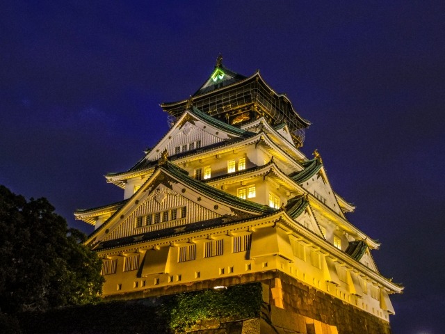 Osaka Castle, a historical symbol, is fully illuminated at night, enveloped in a solemn atmosphere. Light reflects on the stone walls and moats, creating a mystical scene when combined with the surrounding quietness.