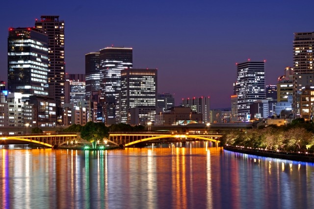 Nakanoshima, located between the Dojima and Tosabori rivers in central Osaka city, is a famous night view spot where historic buildings and modern buildings coexist. The Nakanoshima Public Hall, library, and other buildings are illuminated, and the light reflecting on the river surface creates beautiful reflections.