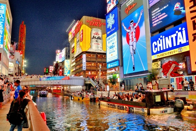 Dotonbori area is one of the liveliest spots in Osaka. Huge billboards, neon lights, and reflections on the Dotonbori River create a unique night view.
