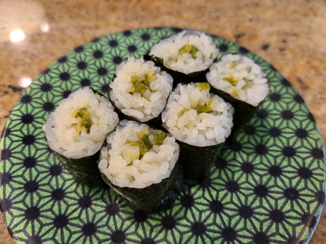 A simple dish where wasabi and vinegared rice are wrapped in seaweed.