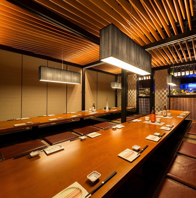 A fusion of western and Japanese stylings in every way, the seating features pub-style booths as well as larger event rooms.