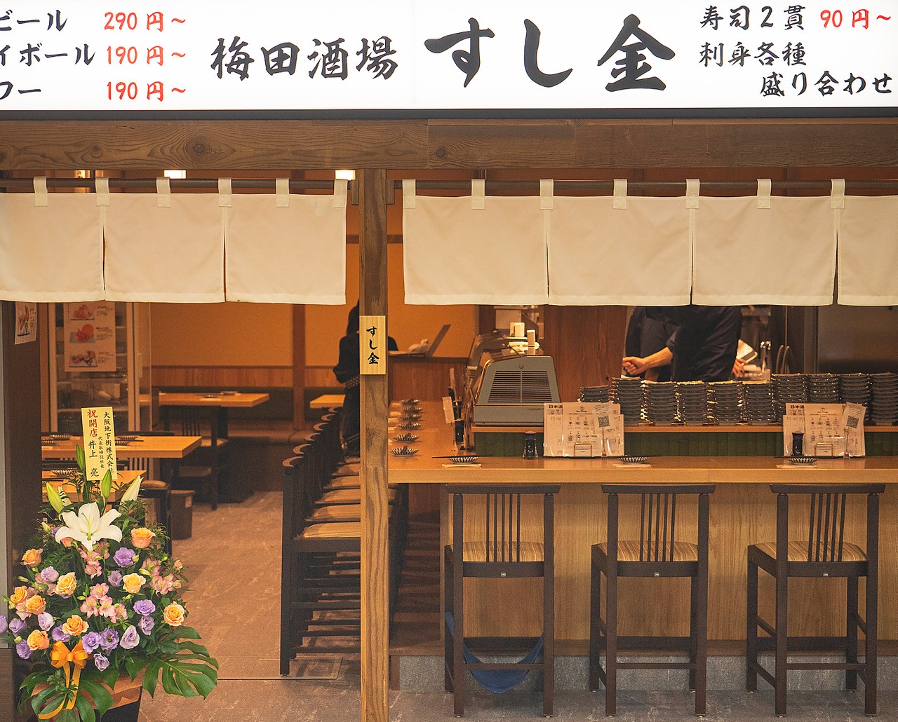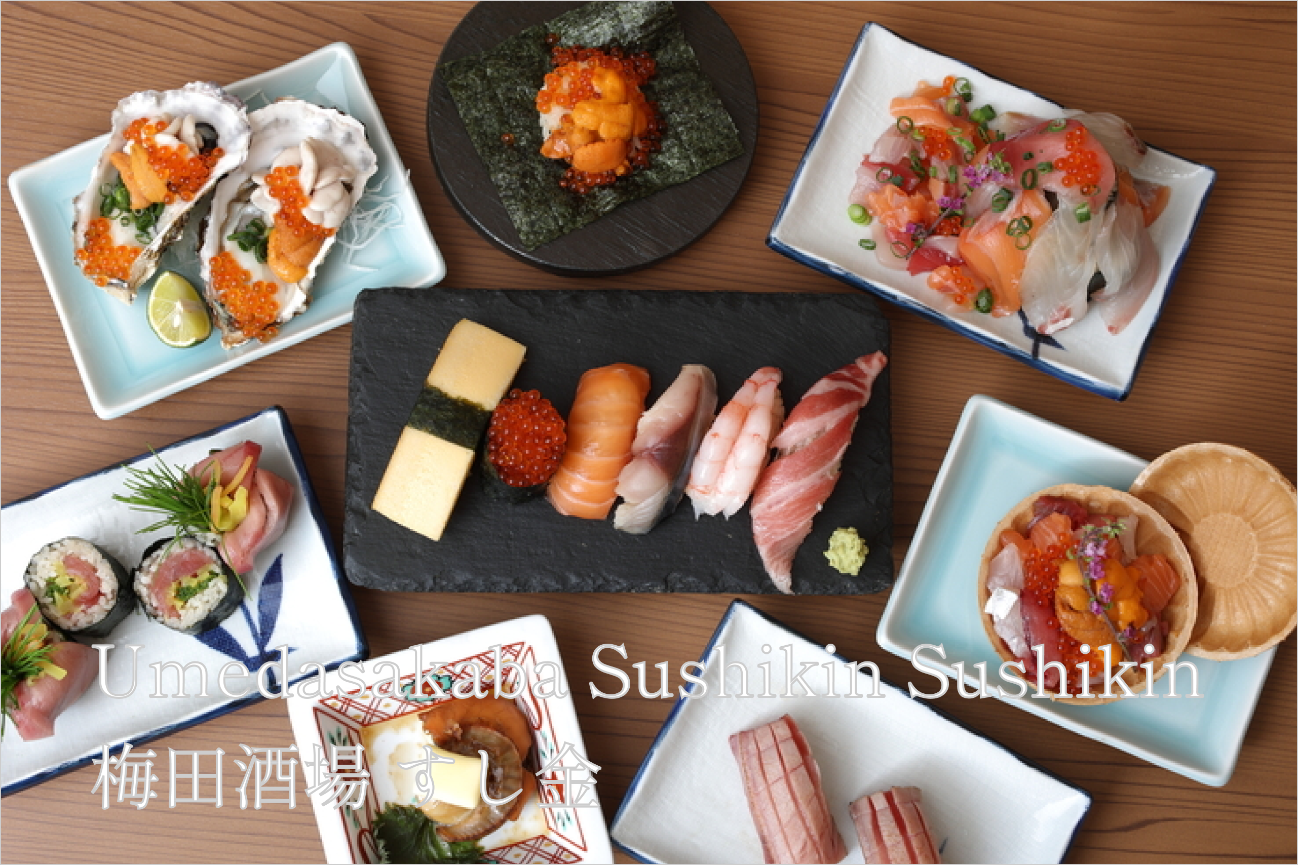 "Umedasakaba Sushikin" is a casual sushi restaurant conveniently located near Osaka and Umeda Stations. You can enjoy beautifully presented sushi and side dishes at affordable prices.
