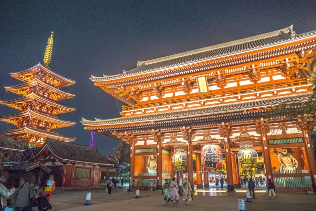 Features: At night, fewer people visit, allowing you to leisurely photograph the illuminated Kaminarimon Gate, five-story pagoda, and Houzoumon Gate. The composition with historic temples and modern Skytree is popular.