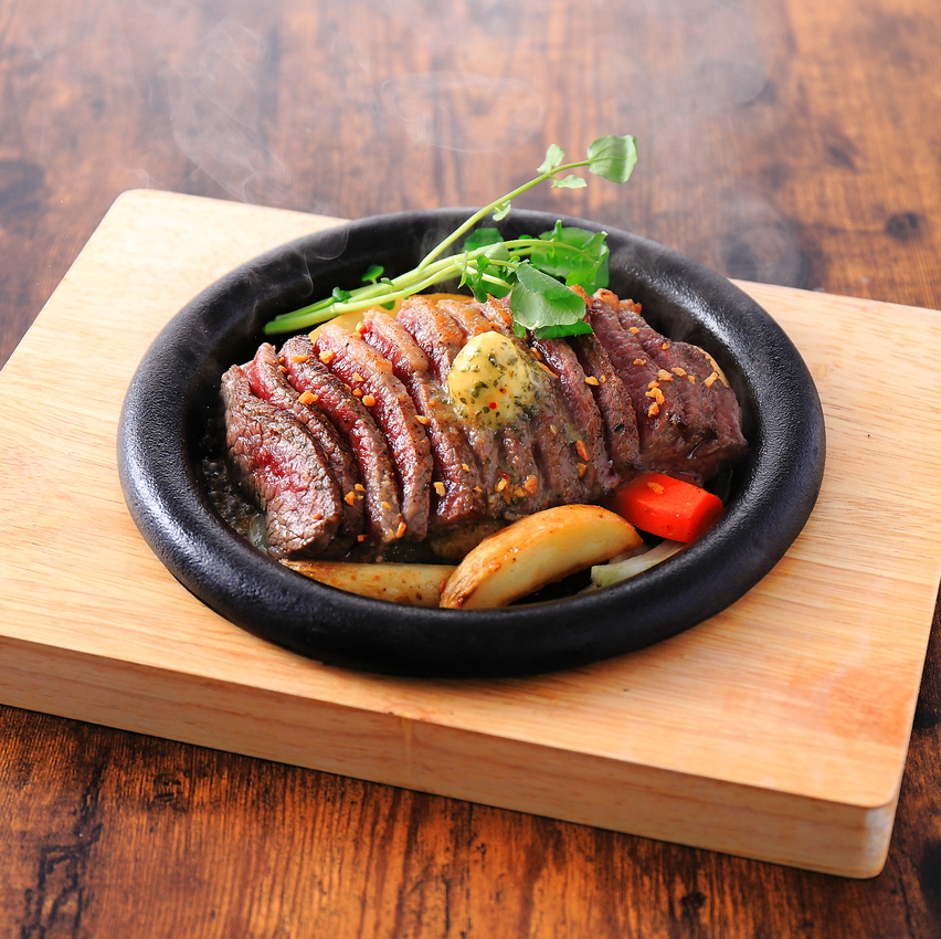 The tender steak, carefully grilled on the iron plate, has plenty of gravy.