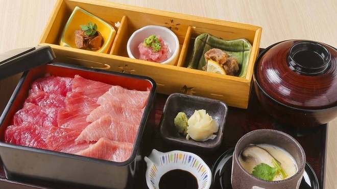 This sashimi platter features fresh tuna meticulously cultivated by Kinki University.