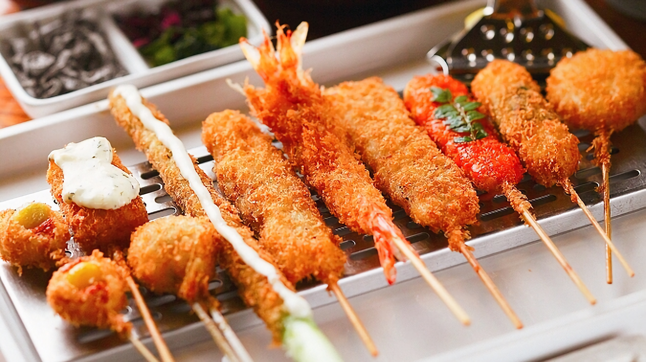 Deep-fried skewers of asparagus, various vegetables, shrimp, crab, and other seafood options are also highly favored.