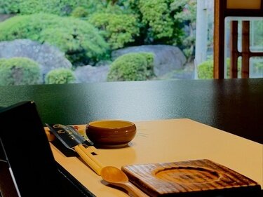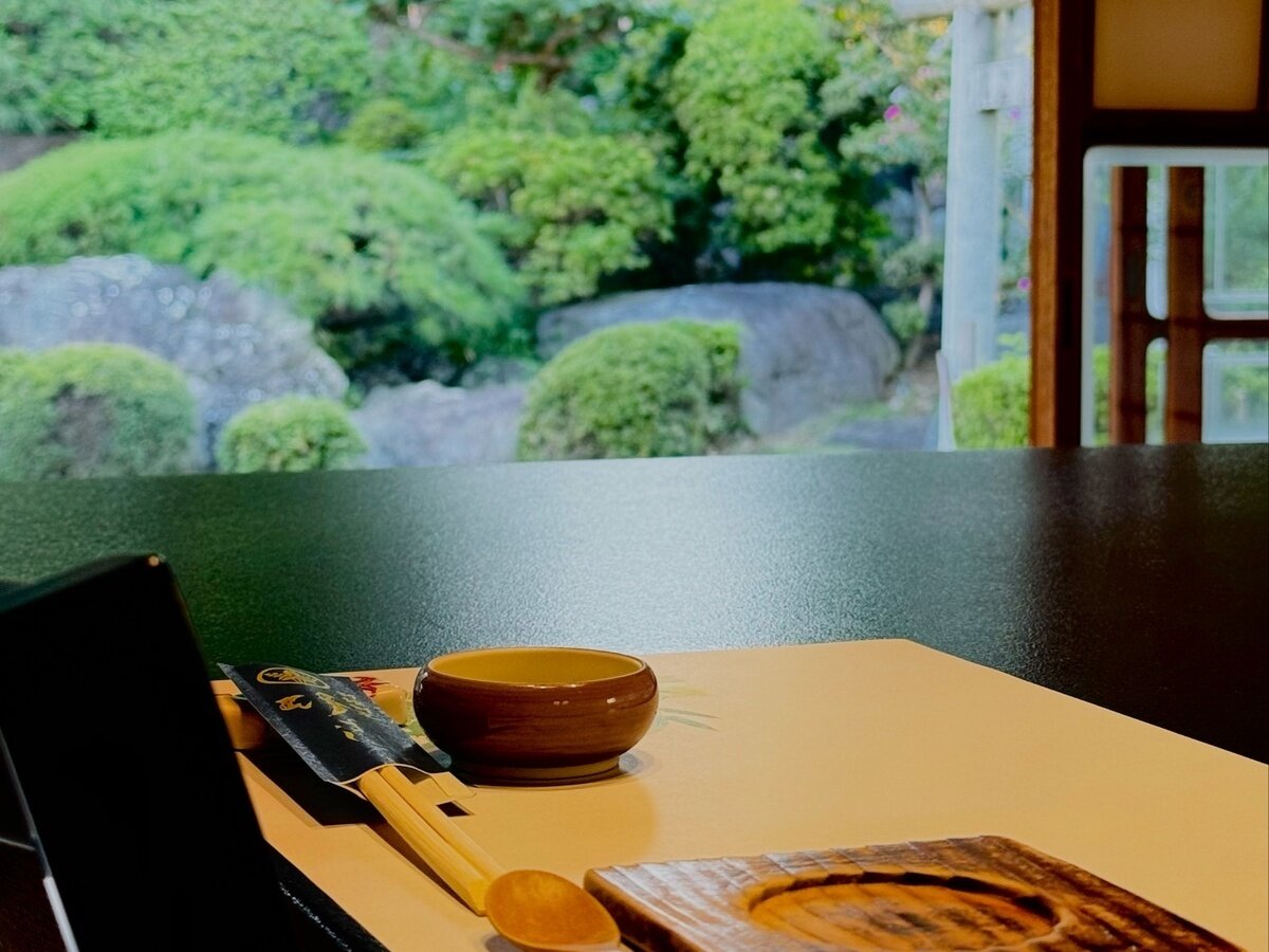 Sushi in a pleasant Japanese-style room with a garden.