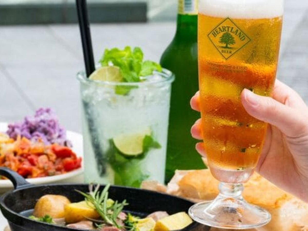 At the terrace seats where you can enjoy the night view of Umeda, there is an all-you-can-drink option for KIRIN Hartland and Ichiban Shibori draft beer.