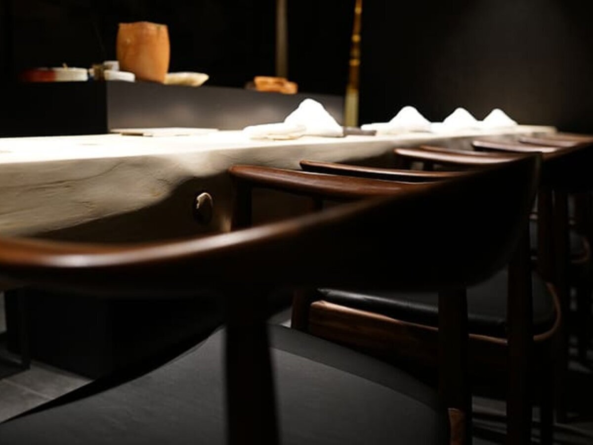 Upon entering through the entrance of a brick building, you will find an extraordinary space. The interior is unified in black, featuring a floating Hinoki wood counter with 7 seats. We hope you visit with family, friends, colleagues, or a partner to indulge in the performance.