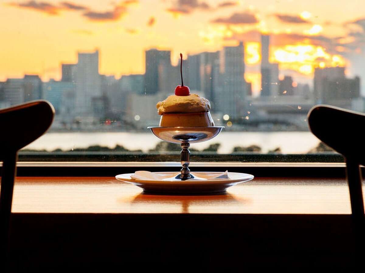 A spacious interior where you can see the Rainbow Bridge from all seats in the store.