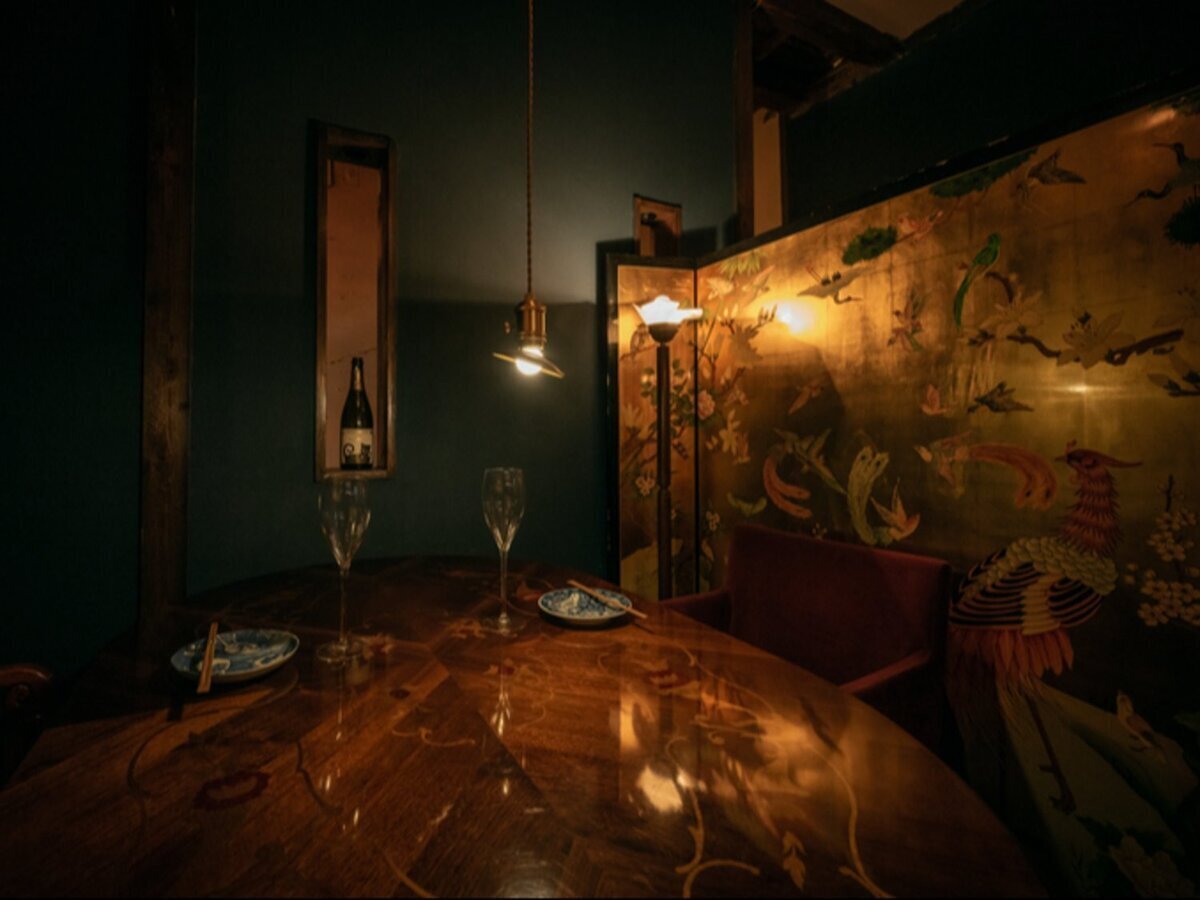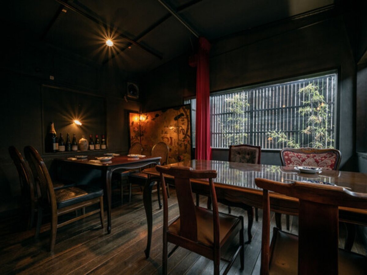 The interior, renovated from a 70-year-old traditional Japanese house, offers a stylish and calm atmosphere with a blend of Japanese and Western decor and subtle lighting.