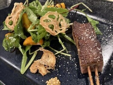 Grilled skewers on an iron plate. We use New Zealand lamb chops, seasonal vegetables, and are working on game dishes.