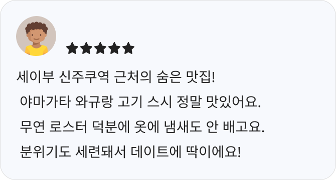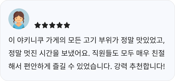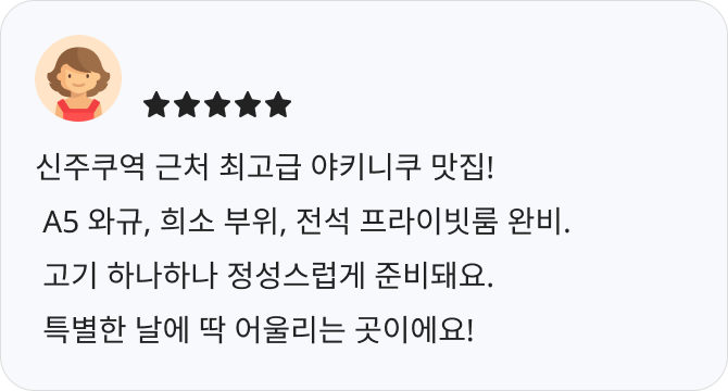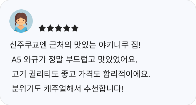- A5 등급 흑모와규를 중심으로, 엄선된 고급 와규를 가성비 좋게 즐길 수 있는 곳입니다.