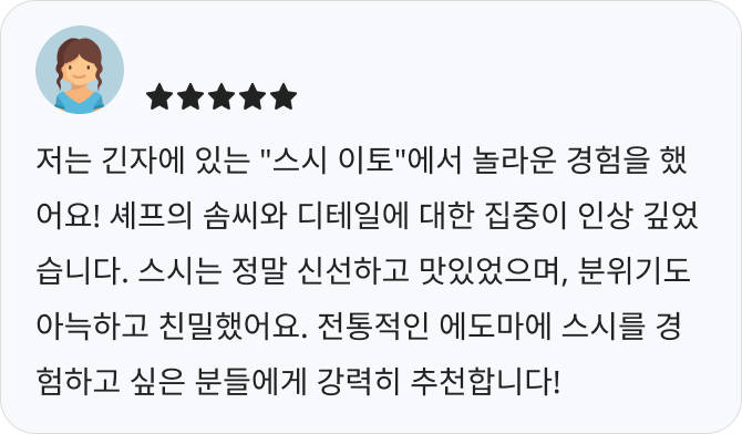 ใSushi Itouใ๋ ๋์ฟ ๊ธด์์ ์์นํ ๊ณ ๊ธ ์ค์ ์ ๋ฌธ์ ์ผ๋ก, ์นด์ดํฐ ์ข์ 8์๋ง์ ๊ฐ์ถ ์๋ดํ ๊ณต๊ฐ์ ๋๋ค. 40๋ ์ด์์ ๊ฒฝ๋ ฅ์ ์๋ํ๋ ์ฅ์ธ์ด ์ง์ ์ด์ํ๋ฉฐ, ์๋๋ง์ ์ค์์ ์ค์ฌ์นด ์ค์๋ฅผ ์ ๊ณตํฉ๋๋ค. ๋งค์ผ ์์นจ ๋์์ค ์์ฅ์์ ์์ ํ ์ ์ฒ ์์ฌ๋ฃ๋ฅผ ์ฌ์ฉํ ์ค๋ง์นด์ธ ์ฝ์ค๊ฐ ์ธ๊ธฐ์ ๋๋ค.