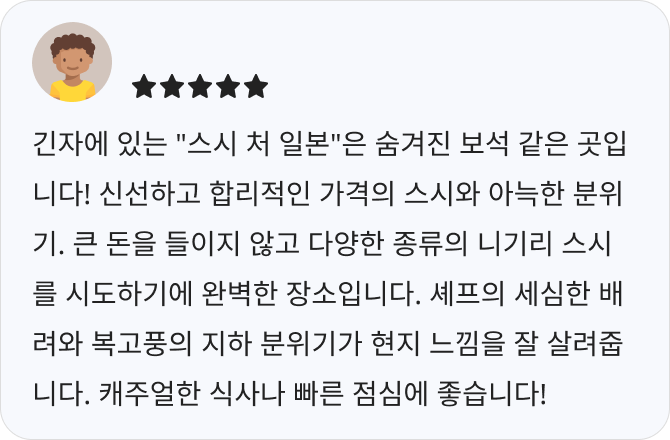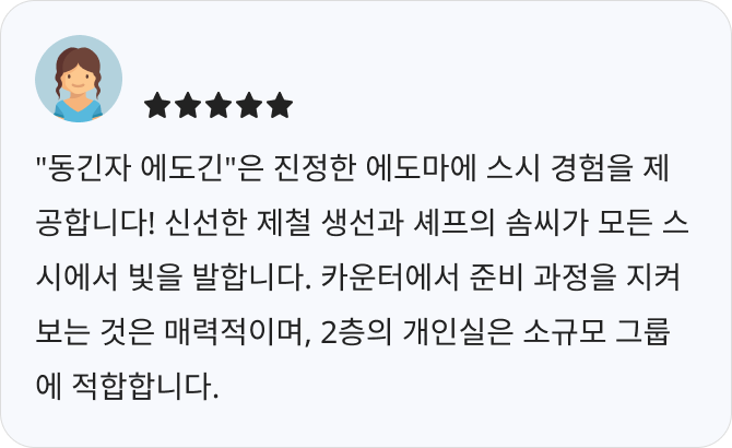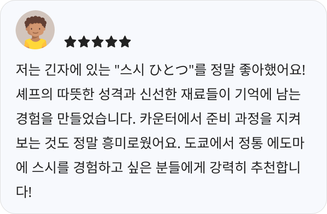 ใSushi Hitotsuใ๋ ๋์ฟ ํ๊ฐ์๊ธด์์ ์์นํ ์ค์ ์ ๋ฌธ์ ์ผ๋ก, ๋ ์ฐฝ์ ์ด๊ณ ์ธ์ฌํ๊ฒ ๊พธ๋ฉฐ์ง ์ธํ ๋ฆฌ์ด๊ฐ ํน์ง์ ๋๋ค. ์ ์ ์ ฐํ๊ฐ ๋ง๋ค์ด๋ด๋ ์๋ก์ด ์คํ์ผ์ ์ค์์ ๊ณ์ ์ ๋ง์ถ ์ผํ ์๋ฆฌ๋ฅผ ์ ๊ณตํ๋ฉฐ, ์ฌ๊ณ์ ์ ๋ง์ ๊ณ ์ค๋ํ ๋ด์๋ ๋๋ค. ๋ฐ๋ปํ ๋ถ์๊ธฐ์ ์ง์ ์๋น์ค๋ ํฐ ๋งค๋ ฅ ์ค ํ๋์ ๋๋ค.