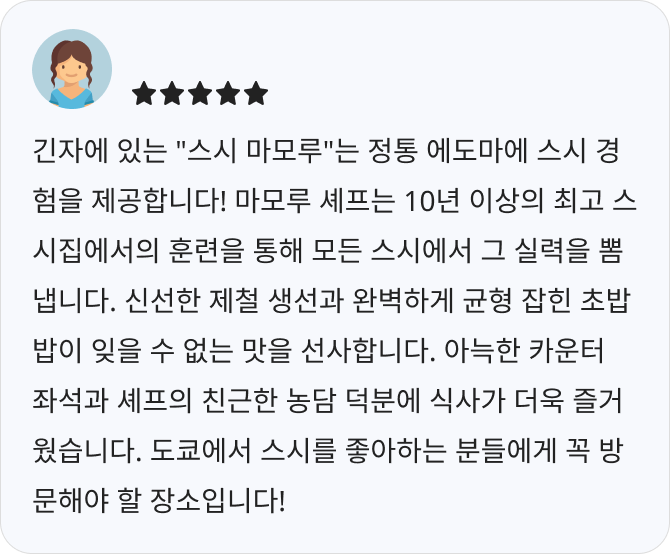 ใSushi Mamoruใ๋ ์ ๋ช ํ ๊ฐ๊ฒ์์ 10๋ ์ด์์ ๊ฒฝ๋ ฅ์ ์์ ์ฃผ์ธ์ด ์ด์ํ๋ ์ค์์ง์ผ๋ก, ๋ฐ์ด๋ ๊ธฐ์ ๊ณผ ์น๊ทผํ ์๋น์ค๊ฐ ๋งค๋ ฅ์ ์ ๋๋ค. ๊ณ ํ์ง์ ์ฌ๋ฃ๋ก ๋ง๋ ๋๊ธฐ๋ฆฌ ์ค์๋ฅผ ์ ๊ณตํ๋ฉฐ, ๊ฐ๊ฒฉ ๋๋น ํ์ง๋ ๋งค์ฐ ๋์ ํ๊ฐ๋ฅผ ๋ฐ๊ณ ์์ต๋๋ค.