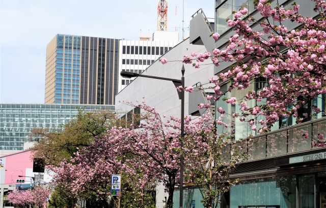 야에스(八重洲)에서는 모던한 고층 빌딩을 배경으로 한 벚꽃 사진이 빛납니다.