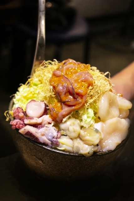 오징어, 새우 등 해산물을 아낌없이 사용한 몬자야키.
