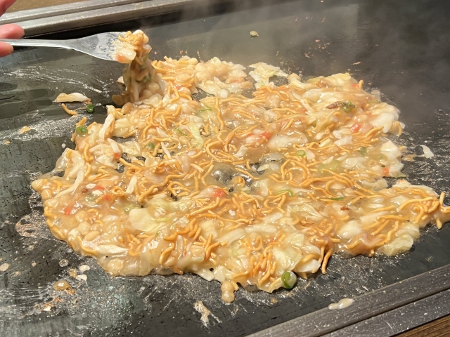 오코노미야키와는 달리, 반죽이 팬케이크처럼 단단하게 굳지 않습니다. 대신, 치즈 퐁듀나 리조또에 가까운 부드럽고 탄력 있는 농도를 유지합니다. 철판에 닿은 가장자리는 바삭하게 익고, 중앙은 녹아내리듯 크리미한 상태를 유지하죠. 이 경험은 마치 구운 치즈 + 일본식 죽 + 철판 요리가 결합된 것처럼 느껴질 수 있습니다.
