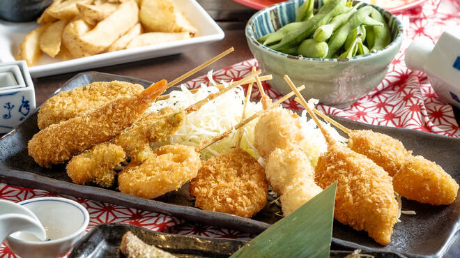 메뉴는 일본 요리의 다양성을 보여주는데, 꼬치튀김은 꼬치에 꽂아 빵가루를 묻혀 튀겨낸 음식이다.