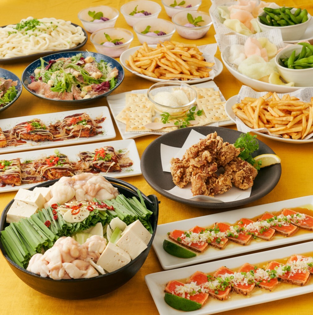 생맥주, 레몬사워, 하이볼, 소주 등 음료 무제한을 1,000엔에 추가할 수 있으며, 닭튀김, 만두 등 튀김류와의 궁합도 최고이다.