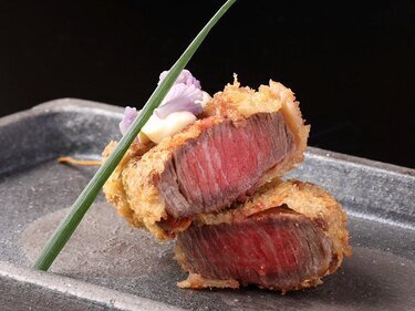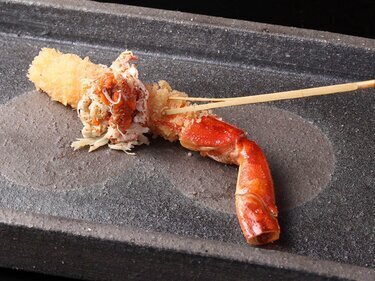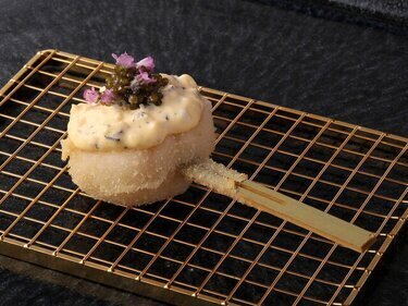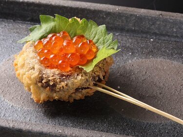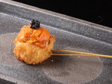 긴자에서는 희소한 꼬치튀김과 초밥, 그리고 캐비아를 조합한 일품 요리를 즐기십시오.