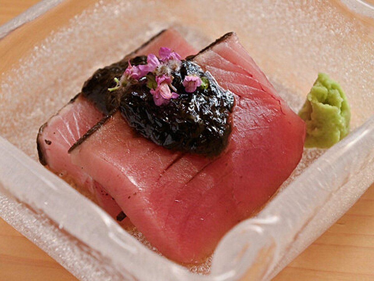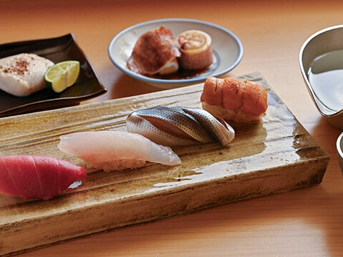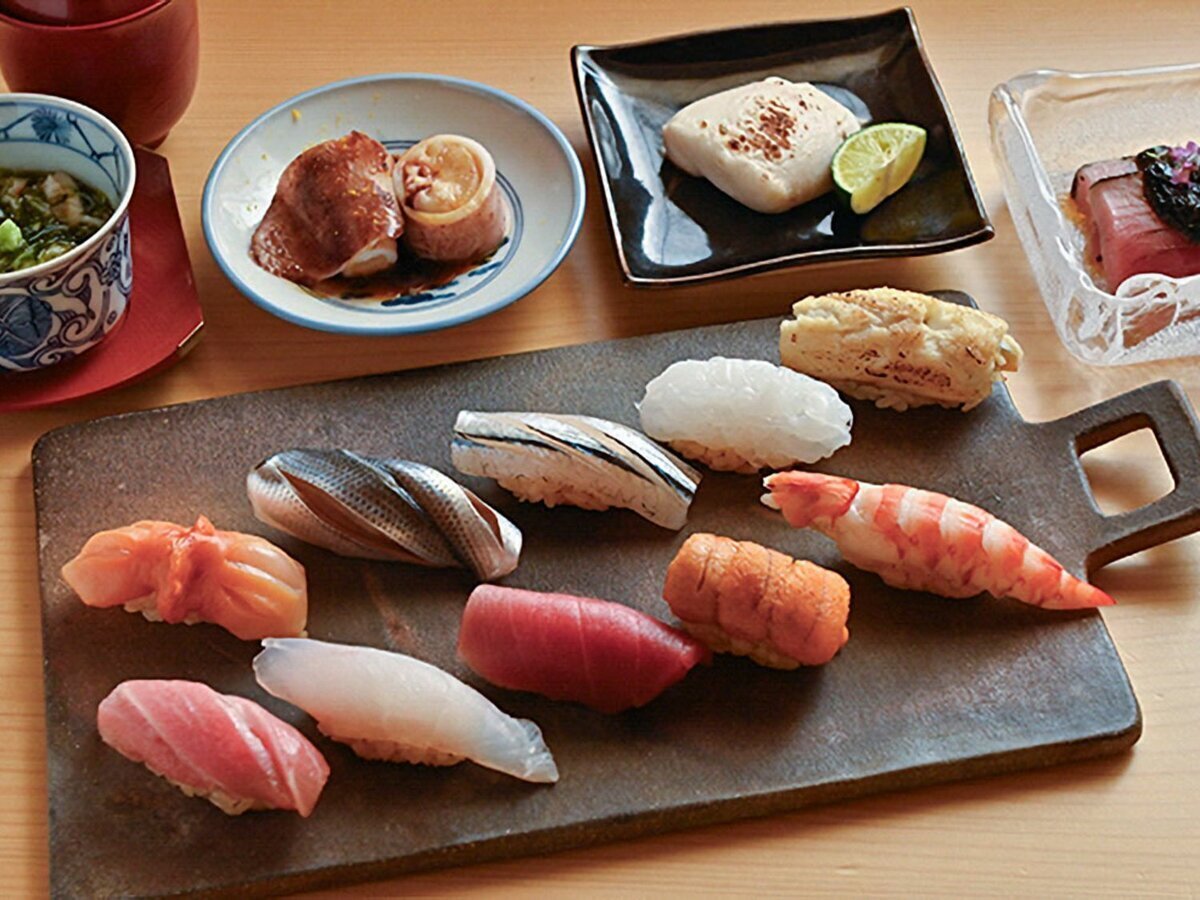 계절의 니기리와 일품 요리로 준비하는 「오마카세 코스」를 제공하고 있으며, 본점과는 다른 3년 숙성 적초를 샤리(초밥 밥)에 사용하여 재료의 맛을 더욱 한층 끌어올립니다.