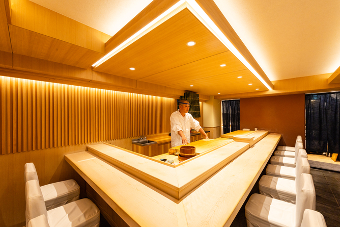 在宁静而精致的日式空间中,曾于银座久兵卫修行25年的厨师,使用直接向日本各地渔民采购的天然海鲜,搭配三种米与三种醋,并以传统江户切子酒器呈现,为宾客奉上高级OMAKASE。