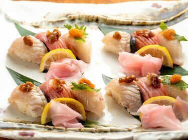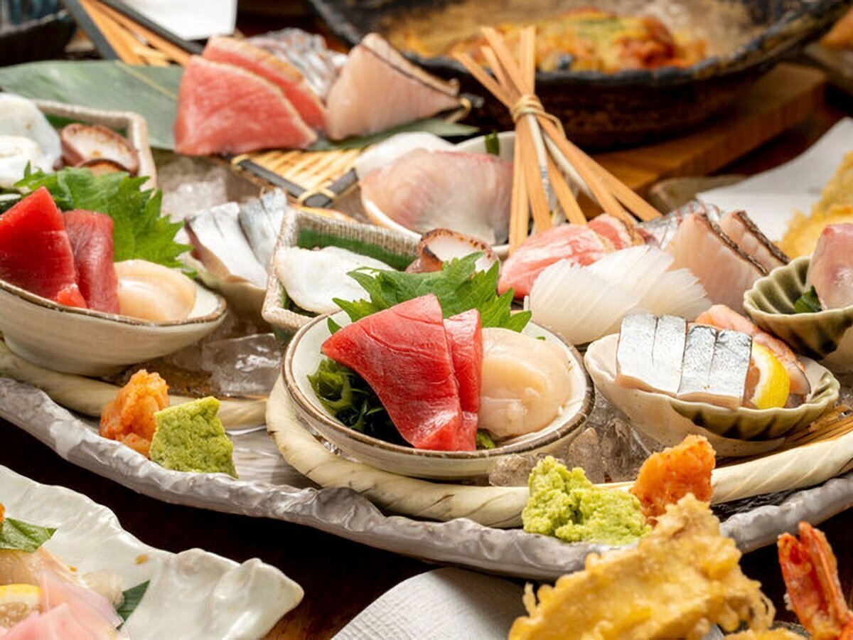 盛有几种海鲜的刺身拼盘,价格从2000日元起,供两人享用,鲜度极佳。