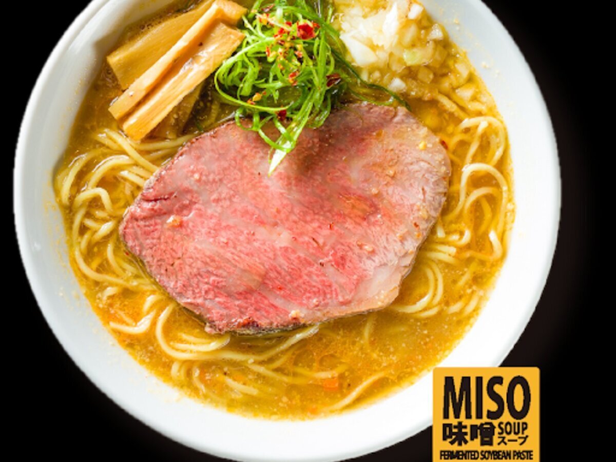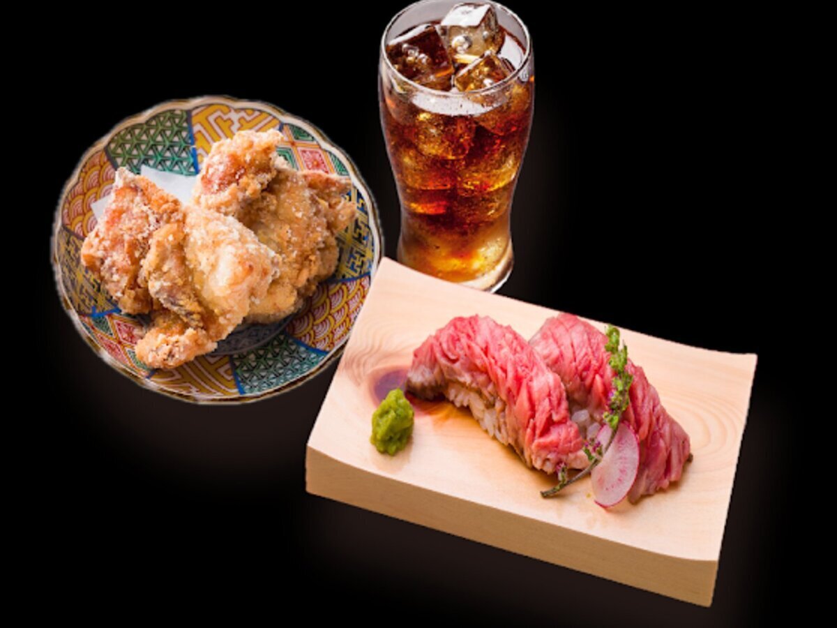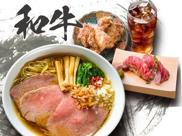 和牛拉面有味噌、酱油、盐三种口味,和牛寿司、炸鸡以及附带饮料的套餐也很受欢迎。
