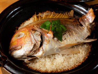 请务必品尝我们厨师的拿手菜 "炖鲷鱼(Tai-chazuke)"和我们的特色釜煮米饭。