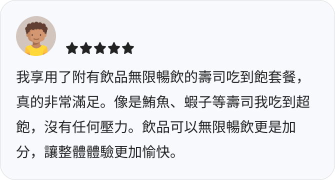 - 提供壽司吃到飽與飲品無限暢飲的選項。