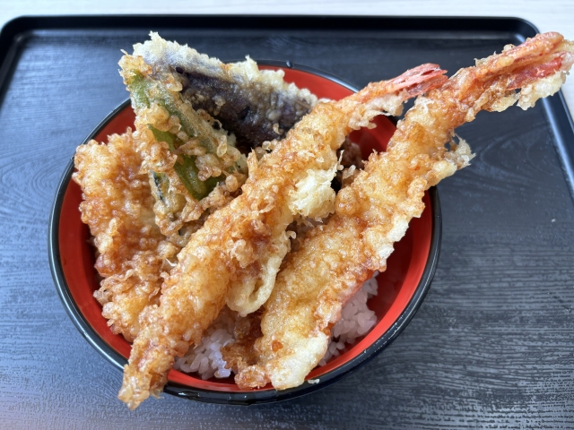天婦羅丼飯是將現炸的天婦羅,放在溫熱白飯上,淋上特製的鹹甜醬。