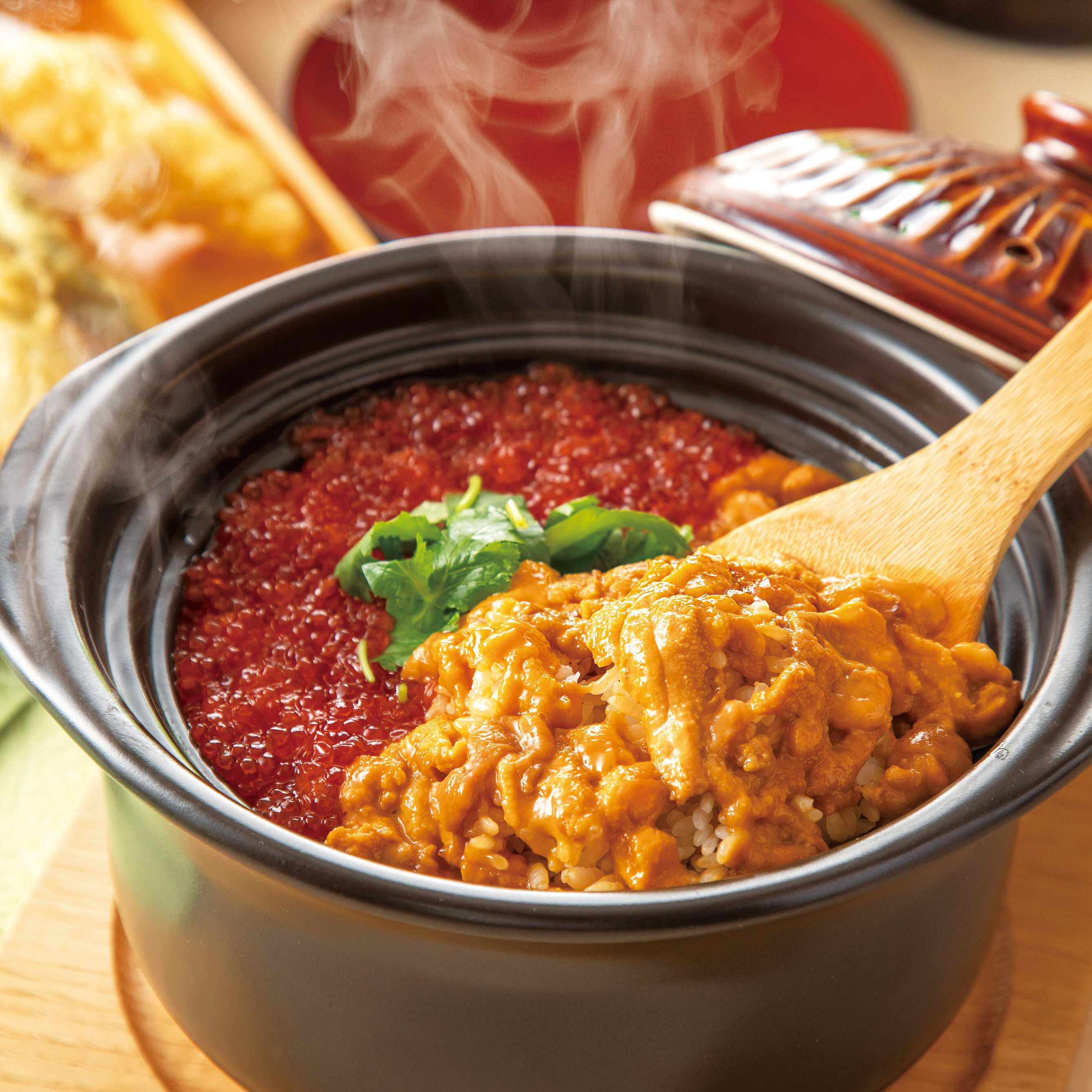 陶鍋料理也是名物,白飯上擺滿各種精心挑選的食材,展現了廚師廚藝的藝術性。