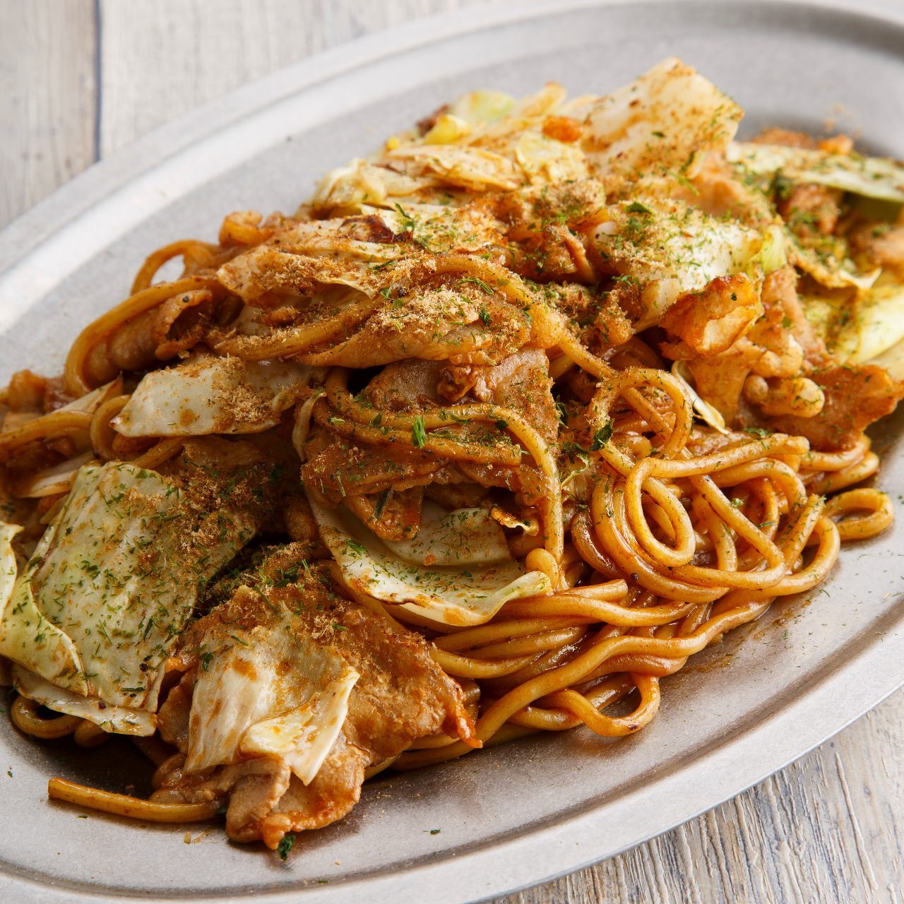 將經典的日本料理「炒蕎麥麵」放在比薩的鐵板上烤製的人氣料理。